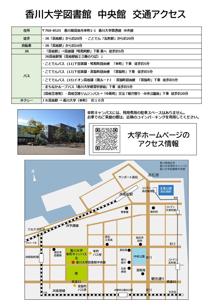 | 住所 | 〒760-8525 香川県高松 市幸町1-1 香川大学図書館 中央館 |
