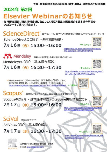 利用講習会開催のお知らせ(ウェビナー)(ScienceDirect/Mendeley/Scopus/SciVal)