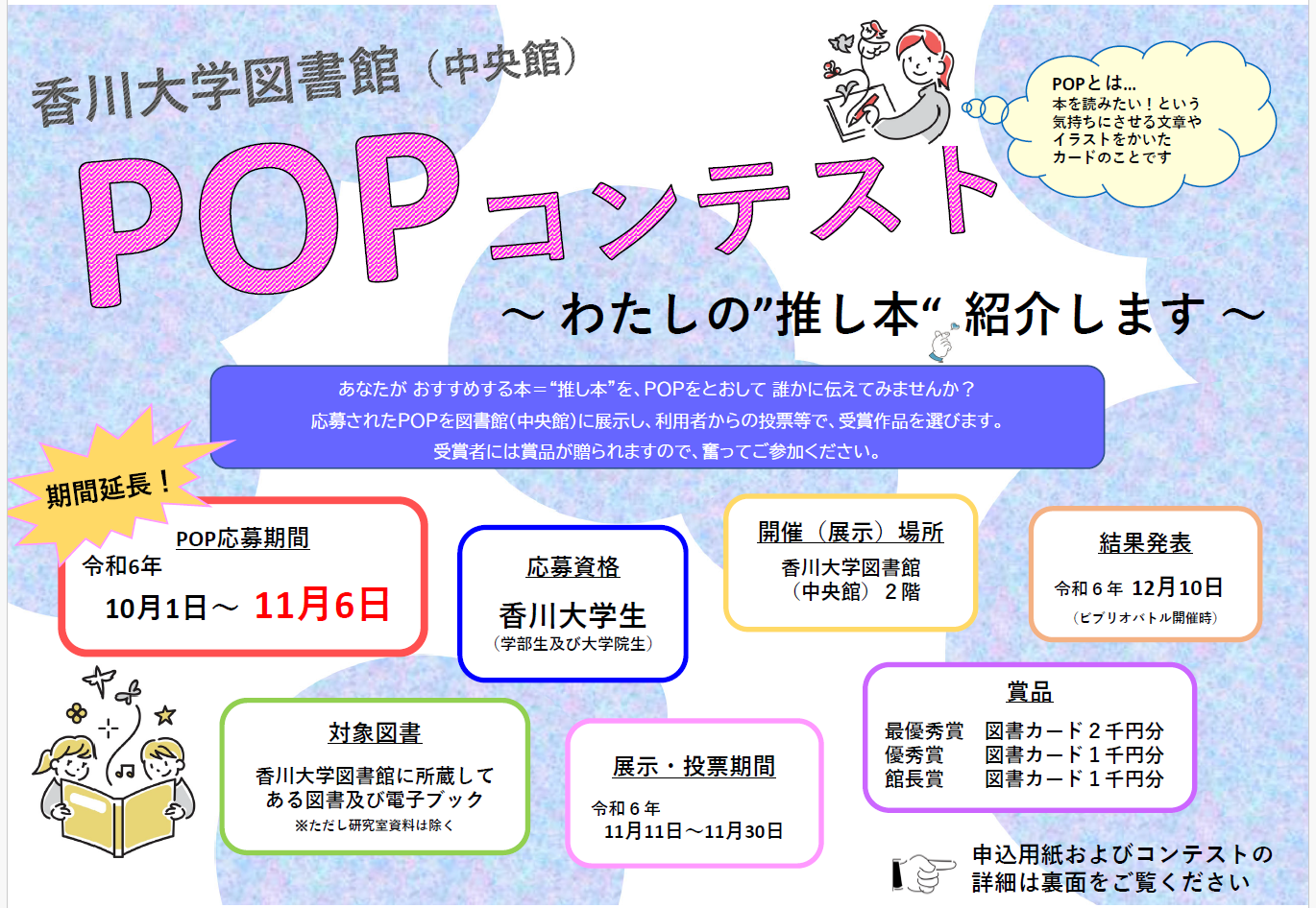 香川大学図書館中央館では、下記日程で図書資料を紹介するPOPコンテストを開催します。