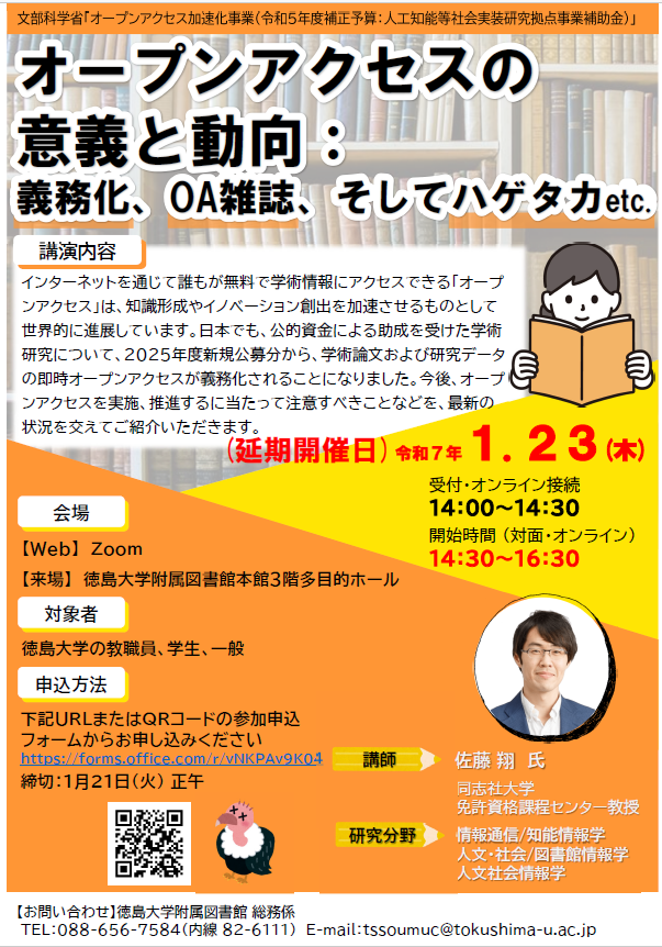 【終了】講演会『オープンアクセスの意義と動向:義務化、OA雑誌、そしてハゲタカetc.』開催のお知らせ@徳島大学附属図書館 (R7/1/23)